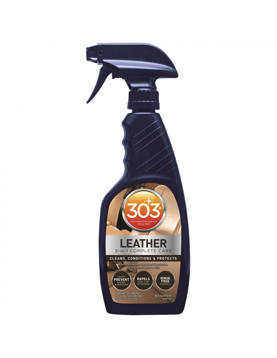 303 Leather 3-in-1 czyści, odżywia i dostarcza ochrony UV powierzchniom skórzanym i winylowym. Oczyszczona powierzchnia pozostaje zabezpieczona co ogranicza przyszłe zabrudzenia. Środek zawiera ochronę przeciw UV aby zapobiegać blaknięciu oraz pękaniu tapicerki. Łatwa w użyciu formuła – po prostu spryskaj i przetrzyj.