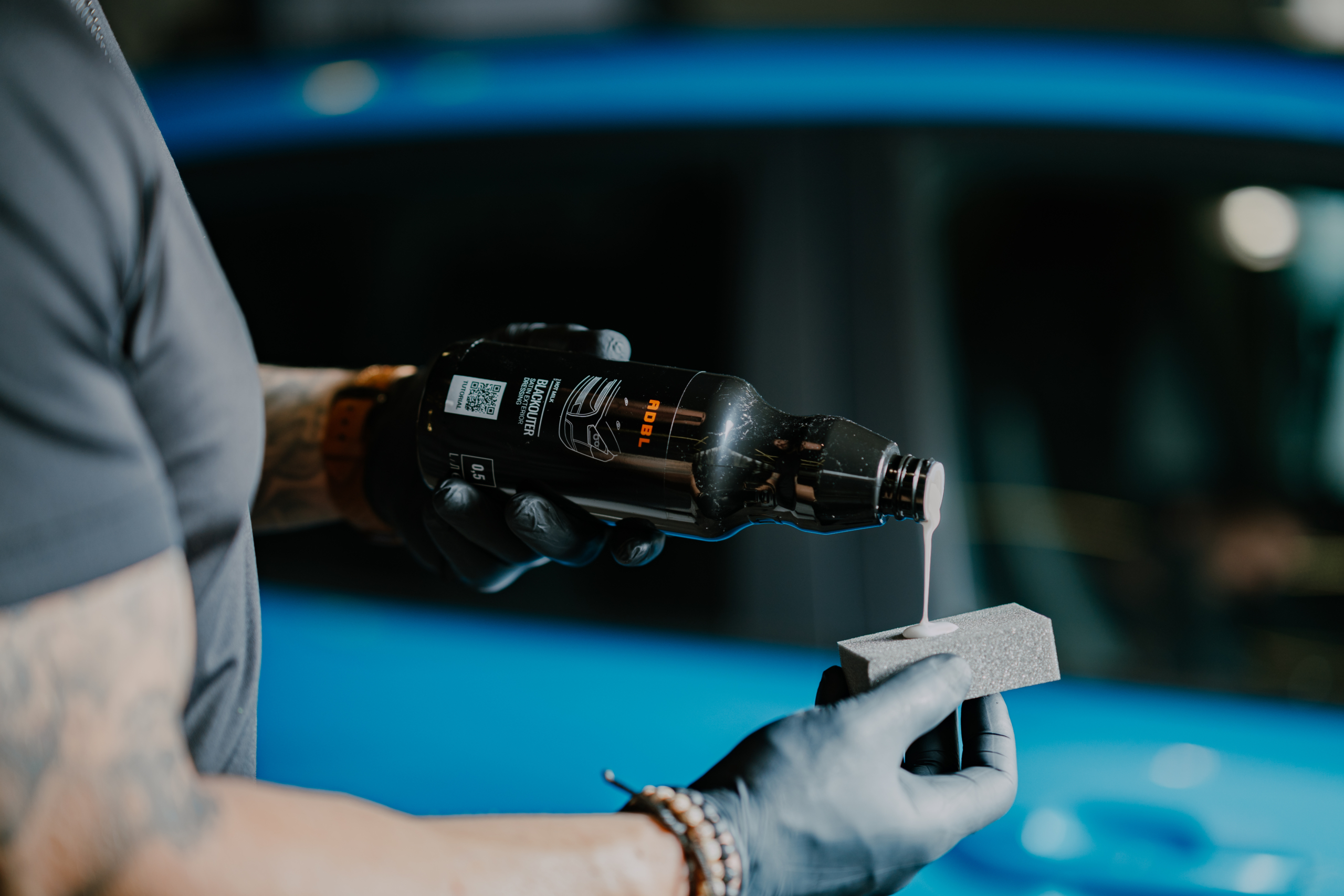 - Rozprowadź równomiernie niewielką ilość produktu za pomocą ADBL Foamburger bądź ADBL One Shot Tire Pad na oczyszczonym, plastikowym elemencie zewnętrznym