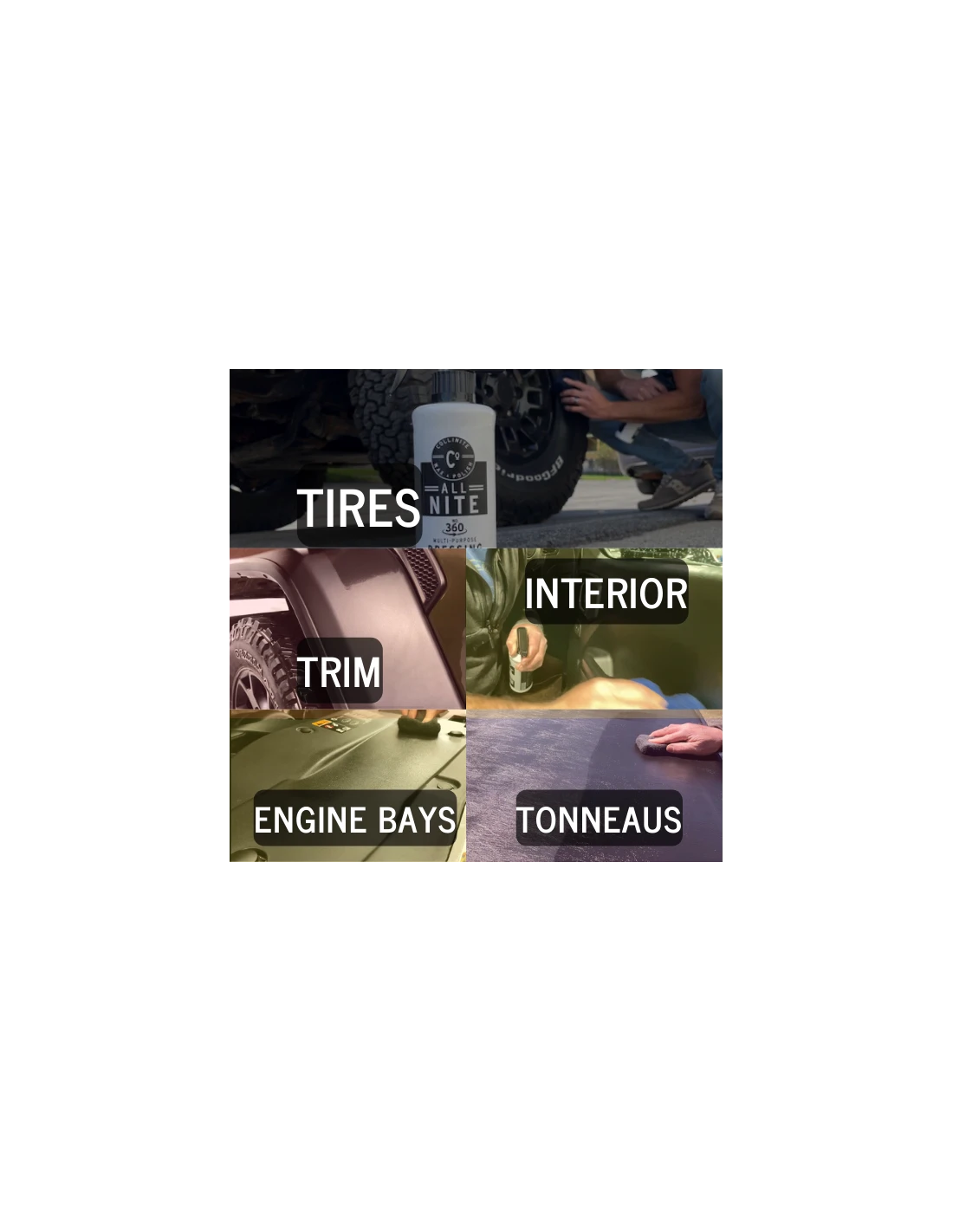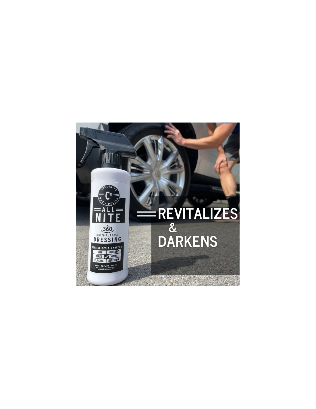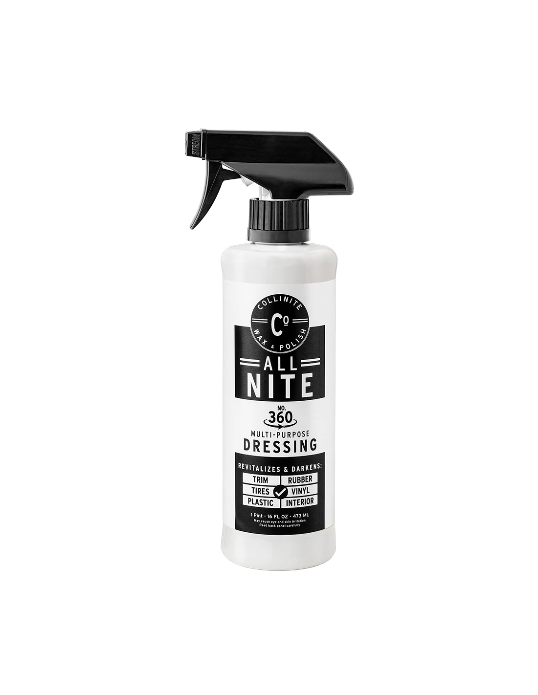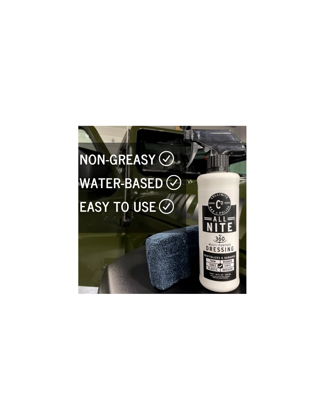 COLLINITE 360 All Nite Dressing to łatwy w użyciu i niezwykle wszechstronny dressing oparty na bazie wody. Przyciemnia i rewitalizuje, przywracając nienaganny wygląd powierzchniom takim jak: opony i guma, wykończenia wewnętrzne i zewnętrzne, teksturowany (nieprzezroczysty) plastik, winyl, komory silnika, pokrywy bagażnika i inne.