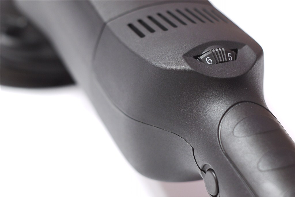 Na grzbiecie urządzenia znajduje się potencjometr obrotów w wersji z „klikami”, co ułatwia kontrolę nad prędkością. Dodatkowo, uchwyt boczny jest pokryty miękką pianką, która skutecznie izoluje drgania.