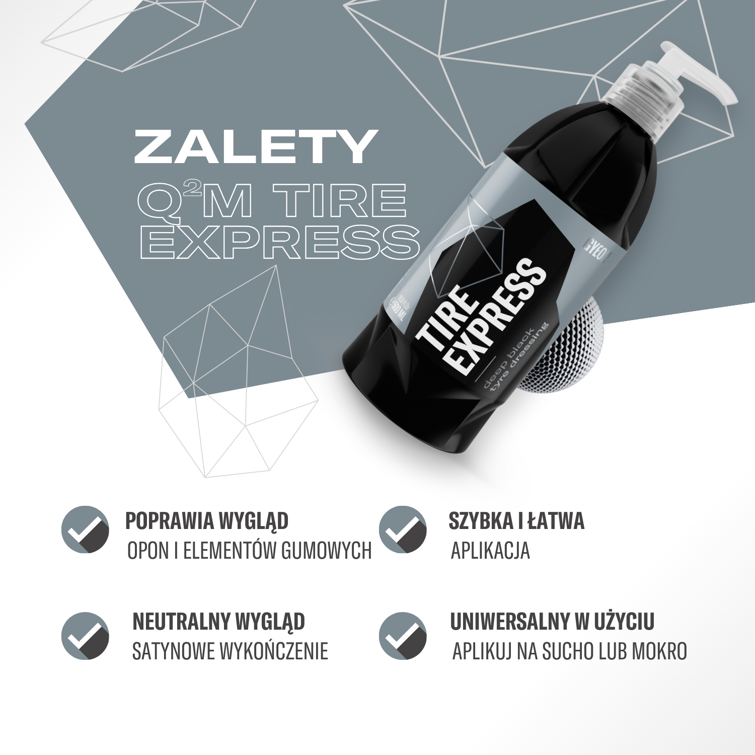 Ten produkt to idealne rozwiązanie dla osób, które chcą szybko i bez wysiłku zadbać o wygląd swojego auta, ciesząc się równocześnie praktyczną ochroną. Niezależnie od tego, czy używasz go po myciu auta, czy do bieżącego odświeżenia – Q²M Tire Express sprawi, że opony zawsze będą wyglądały świeżo i elegancko.