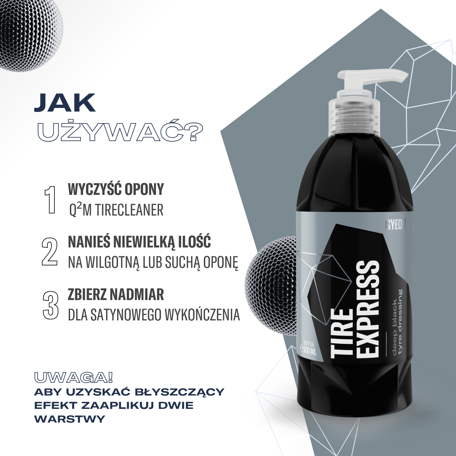 GYEON Q²M Tire Express to niezawodny dressing do opon i elementów gumowych, który łączy szybkość aplikacji z doskonałym efektem wizualnym. Stworzony z myślą o codziennej pielęgnacji, nadaje oponom świeży, fabryczny wygląd, który utrzymuje się przez kilka myć i setki przejechanych kilometrów. Dzięki wodnej formule można go nakładać zarówno na mokre, jak i suche powierzchnie – wystarczy jeden ruch aplikatora, aby uzyskać równomierne pokrycie bez smug czy konieczności długiego wcierania.