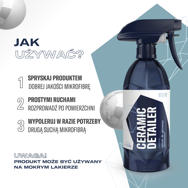 GYEON Q²M CeramicDetailer 500ml to idealne rozwiązanie dla osób, które cenią szybkość, prostotę i efekt “show car” bez wysiłku. Zapewnia połysk, śliskość i trwałą ochronę, a dzięki zawartości SiO₂ przedłuża żywotność powłoki ceramicznej i podkreśla wygląd każdego samochodu.