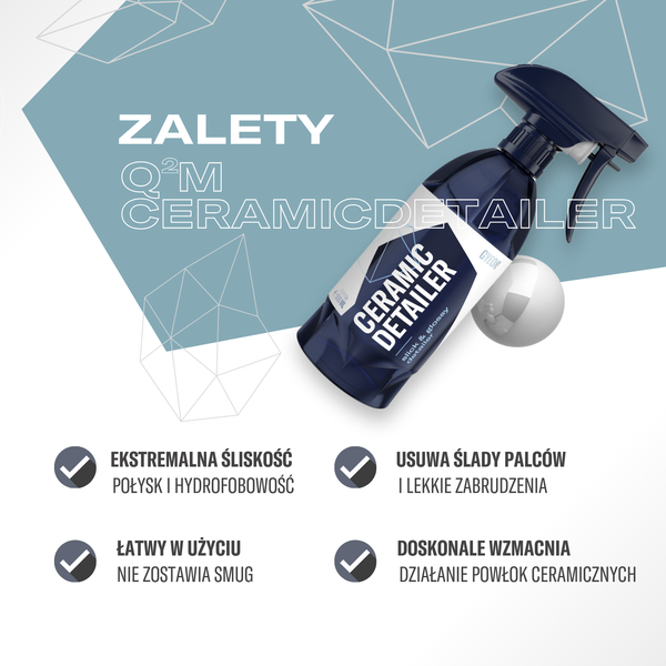 GYEON Q²M CeramicDetailer 500ml to nowoczesny quick detailer na bazie SiO₂, który zapewnia lakierowi niesamowity połysk, śliskość i ochronę. Idealny do pielęgnacji aut z powłoką ceramiczną i bez – działa na mokrej i suchej powierzchni, ułatwiając osuszanie i zabezpieczając lakier przed brudem.