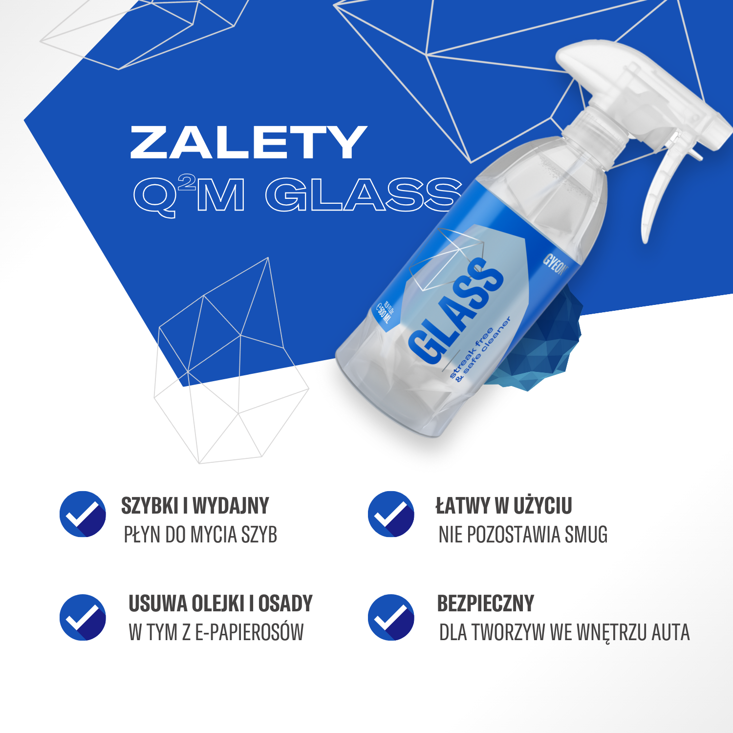 Q²M Glass nie tylko skutecznie czyści, ale także nie degraduje wcześniej naniesionych powłok hydrofobowych, dzięki czemu idealnie nadaje się do pielęgnacji szyb zabezpieczonych produktami takimi jak Q² View czy Q² QuickView.