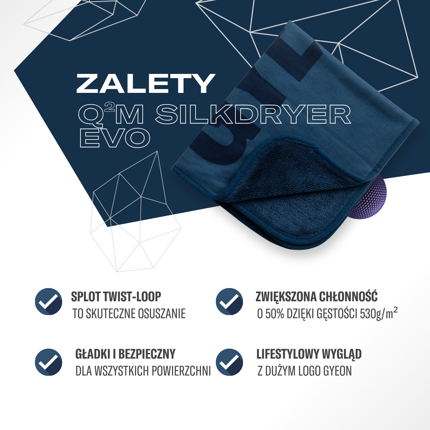 Gyeon Q²M SilkDryer EVO to ulepszona wersja jednego z najbardziej innowacyjnych ręczników do osuszania samochodów na świecie. Wariant EVO charakteryzuje się wyższą gramaturą na poziomie 530 g/m², co znacząco zwiększa jego chłonność i wydajność – całkowita absorpcja wody jest aż do 50% wyższa niż w poprzednim modelu.
