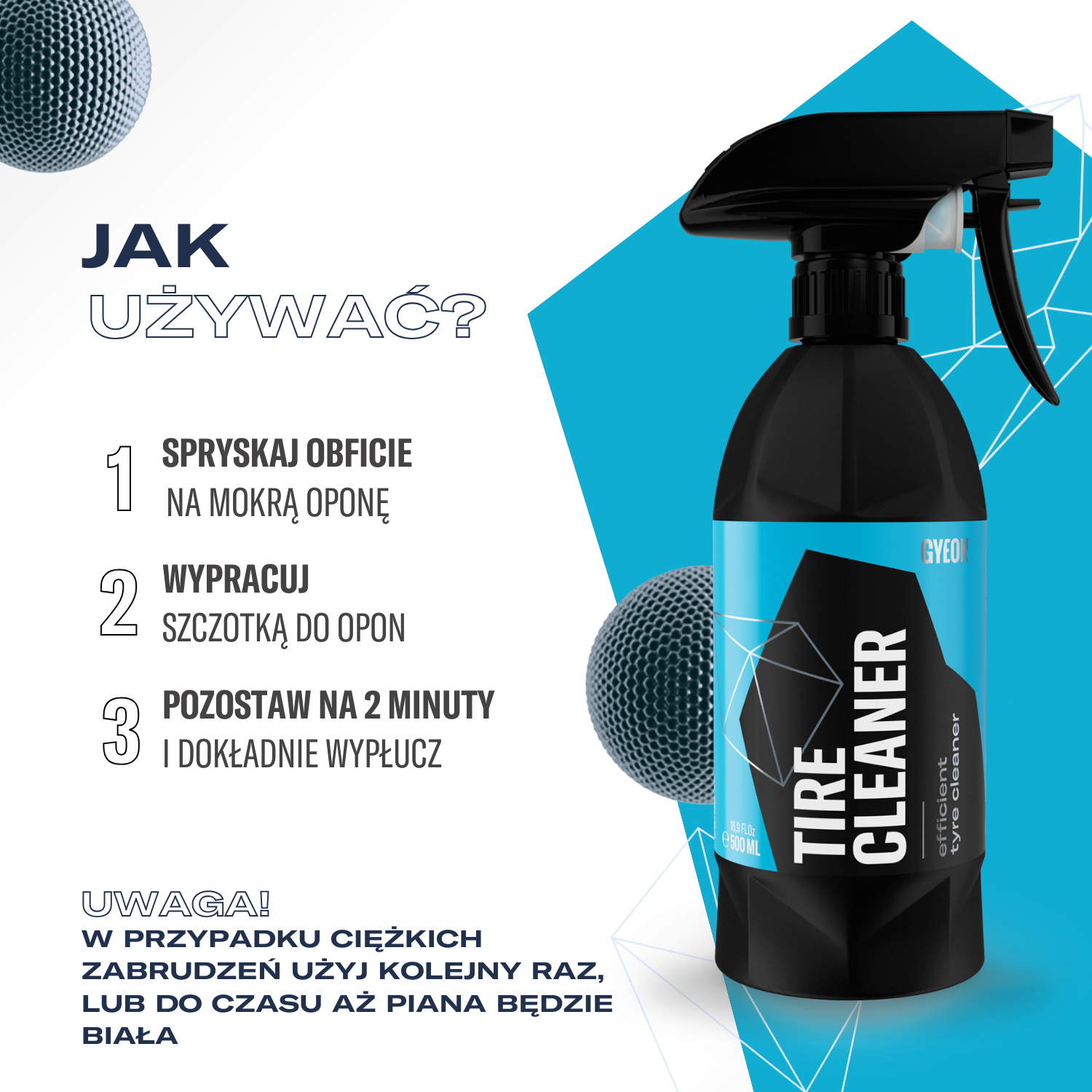 GYEON Q²M TireCleaner 500ml to silny i bezpieczny środek do gruntownego czyszczenia opon oraz gumy. Skutecznie usuwa stare dressingi i głębokie zanieczyszczenia, przygotowując powierzchnię pod nową ochronę. Bezpieczny dla felg z powłoką ceramiczną i opon klasycznych.