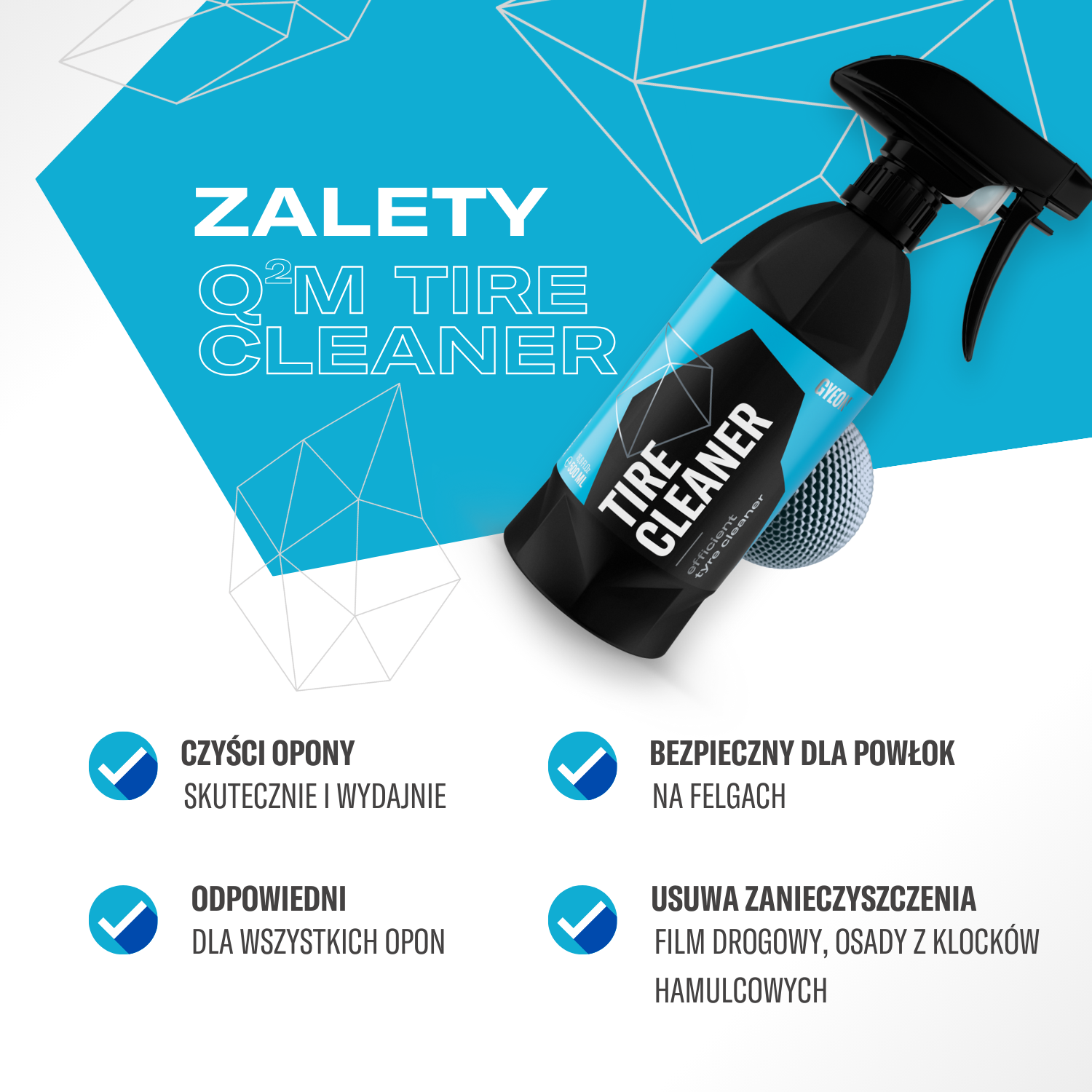 Q²M TireCleaner to unikalna formuła zaprojektowana do czyszczenia wszystkich gumowych elementów Twojego auta. Wsiąka głęboko w porowatą strukturę materiału i luzuje nagromadzony brud i zanieczyszczenia. Q²M TireCleaner rozpuszcza dressingi do opon i przygotowuje powierzchnię do aplikacji nowego dressingu.