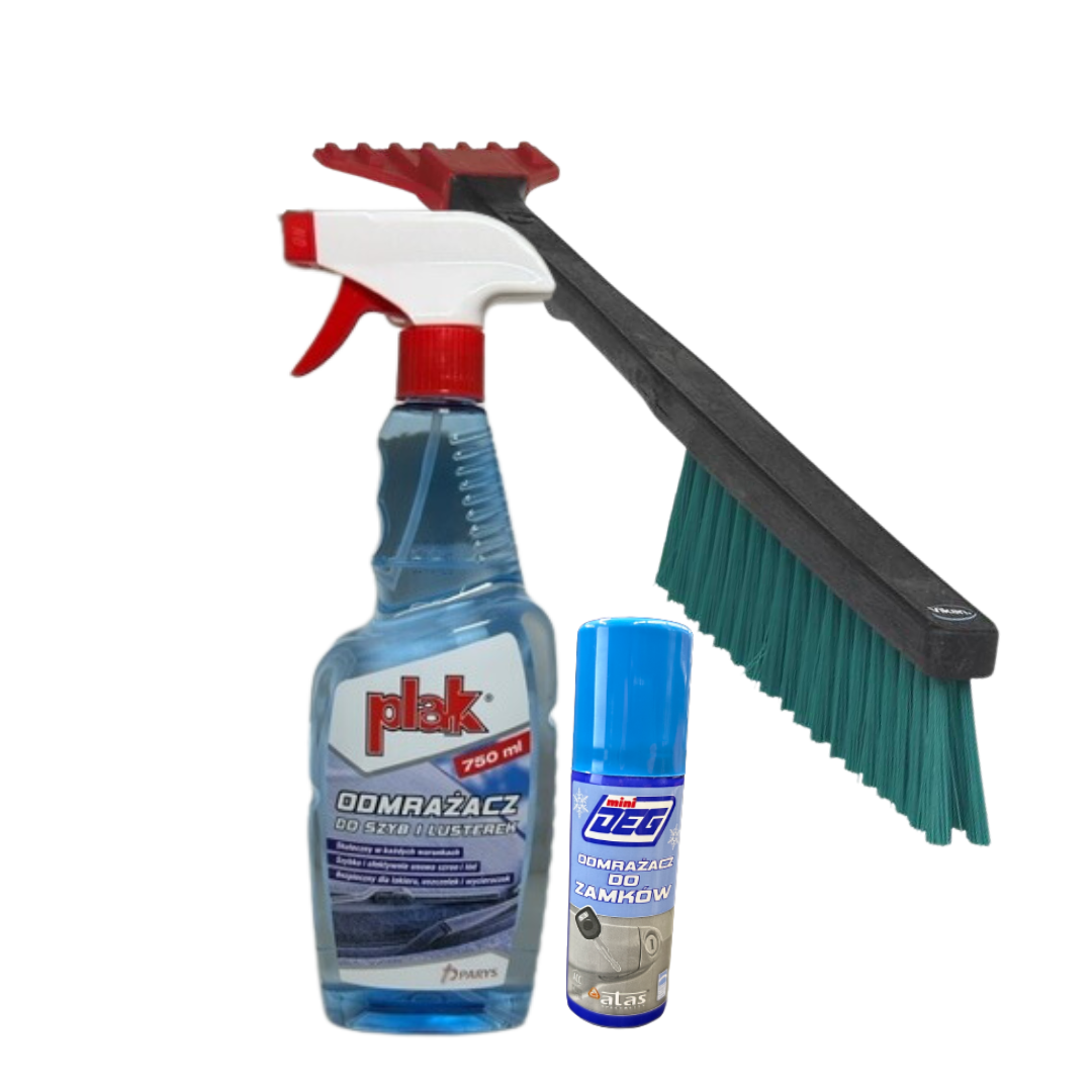 - Kompleksowa ochrona – Zestaw zawiera produkty do walki z lodem i śniegiem oraz do odblokowywania zamków.