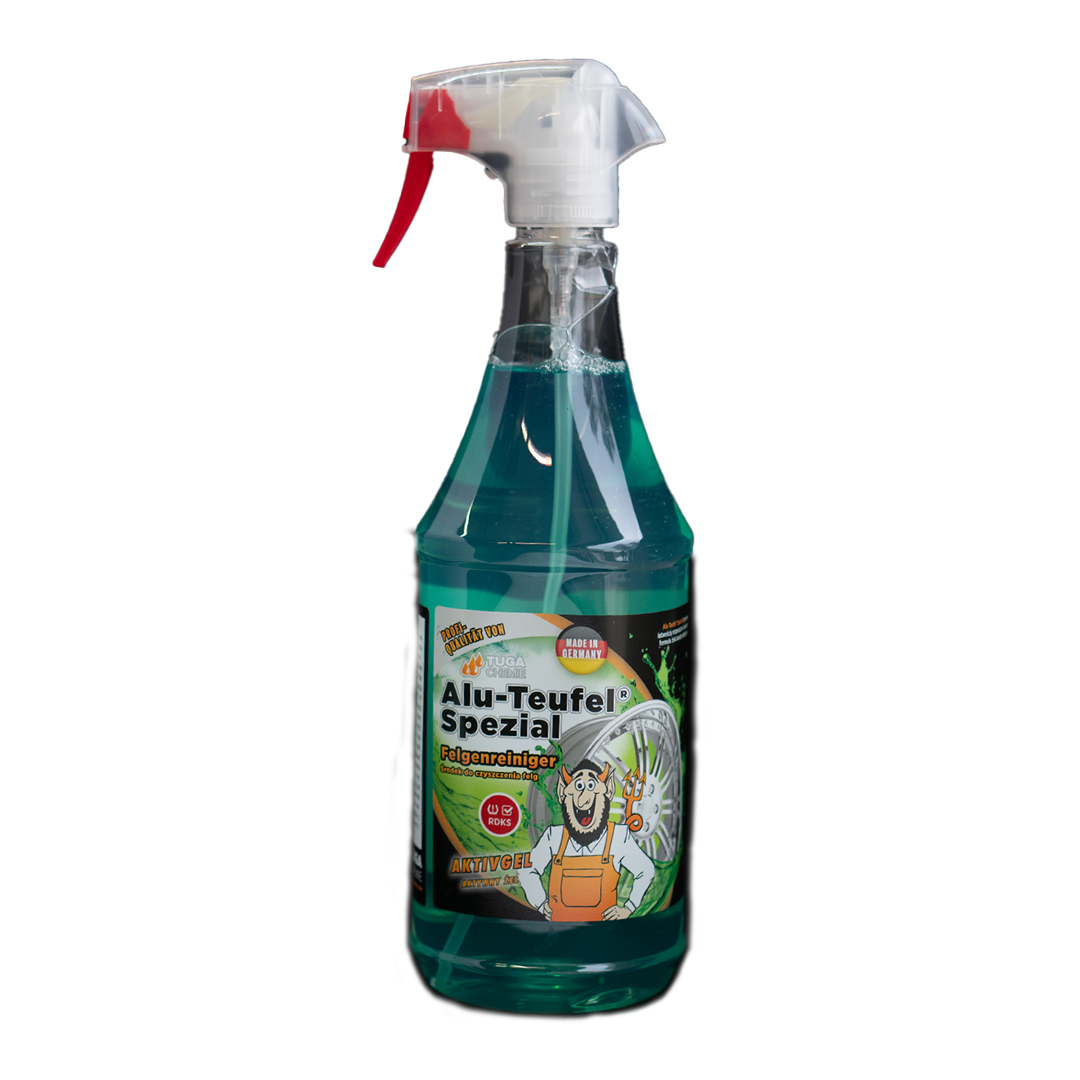 Tuga Chemie Alu Teufel Spezial 1L krwawiący żel do felg jest znanym niemieckim preparatem przeznaczonym do usuwania osadów metalicznych. Preparat ma formę fluidowego żelu o neutralnym pH, bez dodatku fosforanów. Dokładnie przylega do podłoża, przez co pozwala skutecznie rozpuścić brud. Jest dedykowany głównie do felg aluminiowych polerowanych, chromowych, malowanych, wieloczęściowych-skręcanych, a także stalowych.